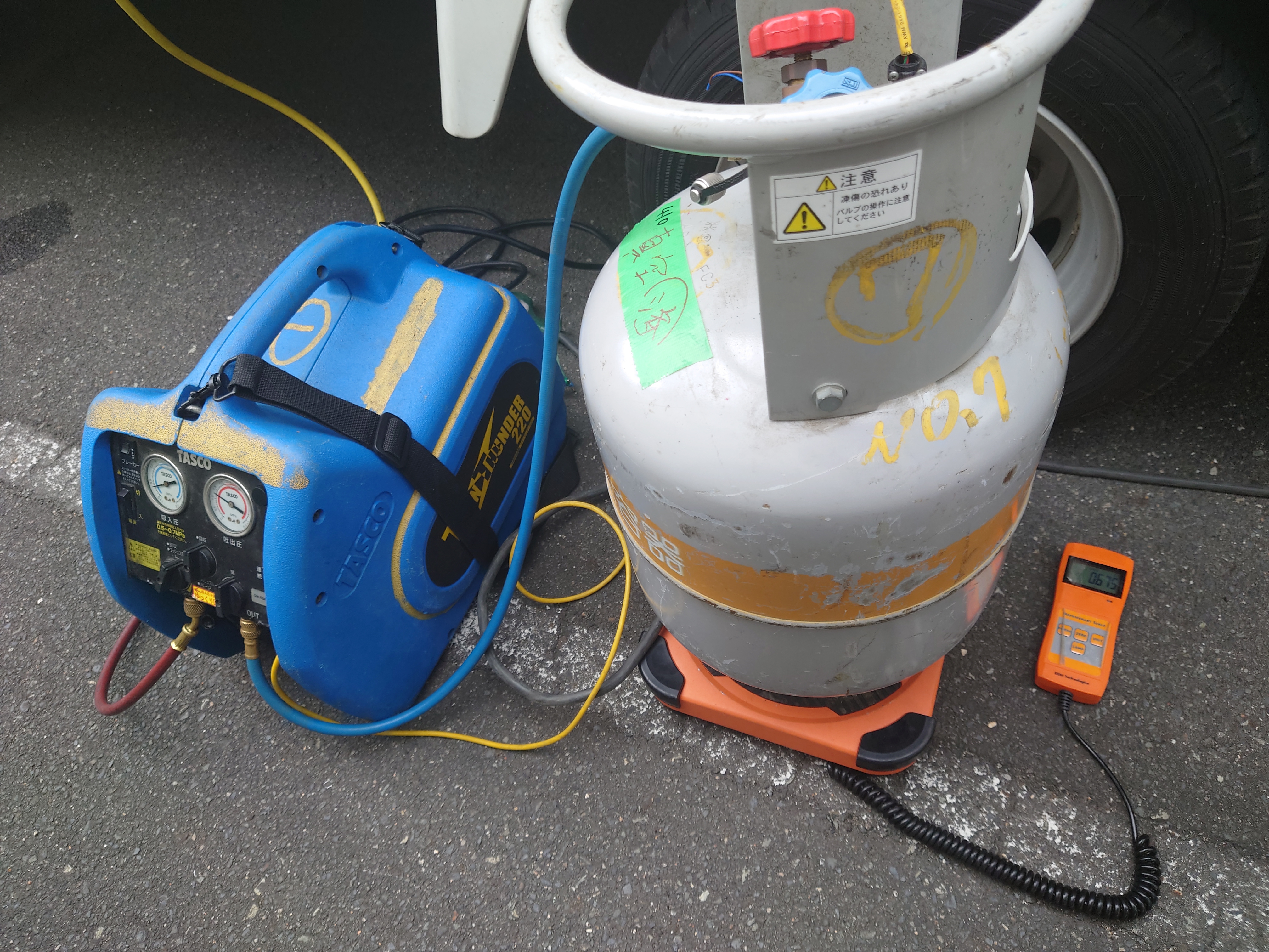 京都で店舗用エアコンの更新工事 フロンガスの回収作業中🔧 店舗様のエアコンを更新作業しております!! 室外機からフロンガスを回収機にて回収作業している様子になります。 当社は エアコンのフロンガスの販売や回収作業で年間5トン以上の実績があります。 フロン回収作業、漏電点検、エアコンの新設工事など、何でもエアコンに関することはお気軽にお問い合わせください!!