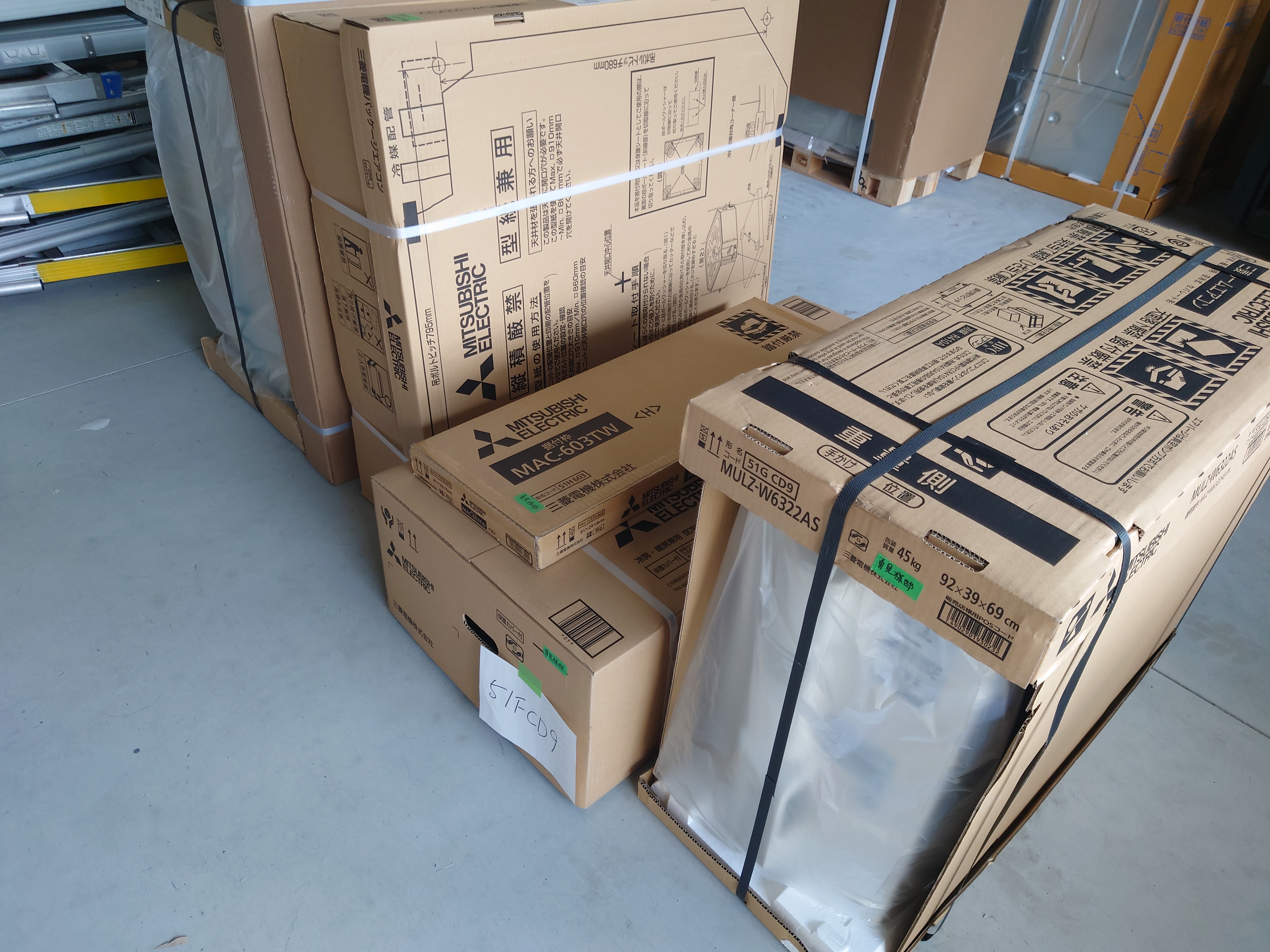 京都市のお客様と滋賀県大津市のお客様、本日は2件!! 隣には、別班のビル用マルチエアコン の室内機12台が納品、 多分、この夏だけで100台以上のエアコンが納品され現場の方で取り付けされています。 まだまだ暑い日が続いています。熱中症に気を付けください!