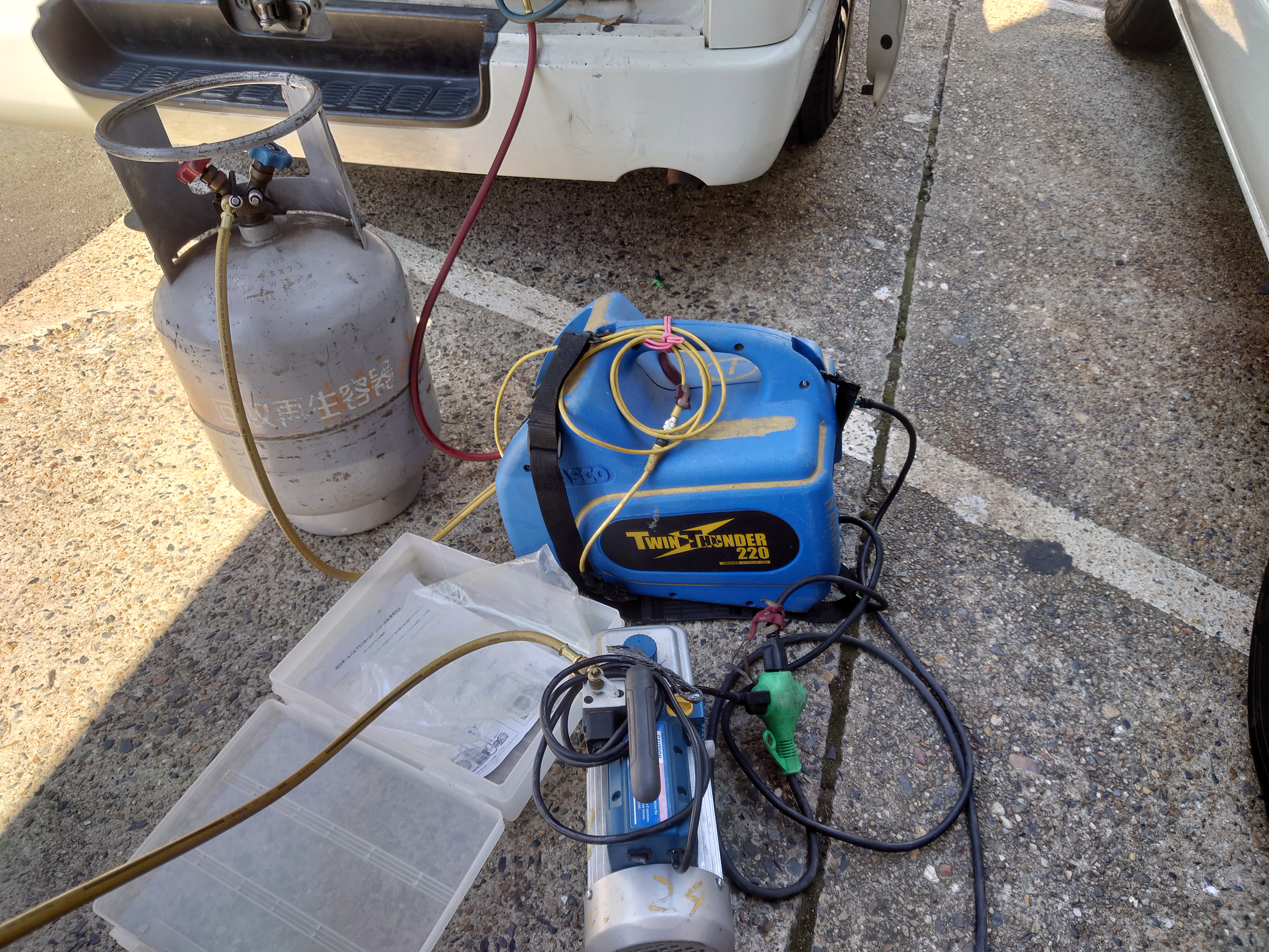 京都でフロンガス回収作業 フロン漏洩点検もお任せ下さい!! フロンガスを回収しながら、空きボンベは真空引き作業(*^^*) せっかちのように思えますが、効率良い作業見本です。 エアコンの故障、入替、移設、洗浄、フロン漏えい点検等、 どんな事でもエアコン工事ならエアコンマイスター デヴァシオンに一度ご相談下さい(^-^)/
