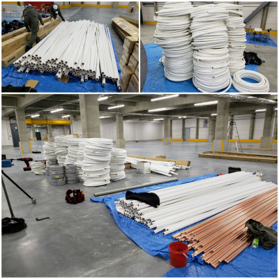大規模倉庫で業務用エアコン取り付け工事! 大型業務用エアコンの配管達です! 行き帰り、いわゆるガス管液管で約4400mです。 今回はほとんどの社員で一気に仕上げて行くつもりなので 15、6人でエアコンの配管だけなら10日もあれば粗方やりきれてしまいます! 若いスタッフも大勢いるので仕事は綺麗で早い!です。 また、進捗情報アップしますね~ エアコンの故障、入替、移設、洗浄、フロン漏えい点検等、 どんな事でもエアコン工事なら一度ご相談下さい(^-^)/