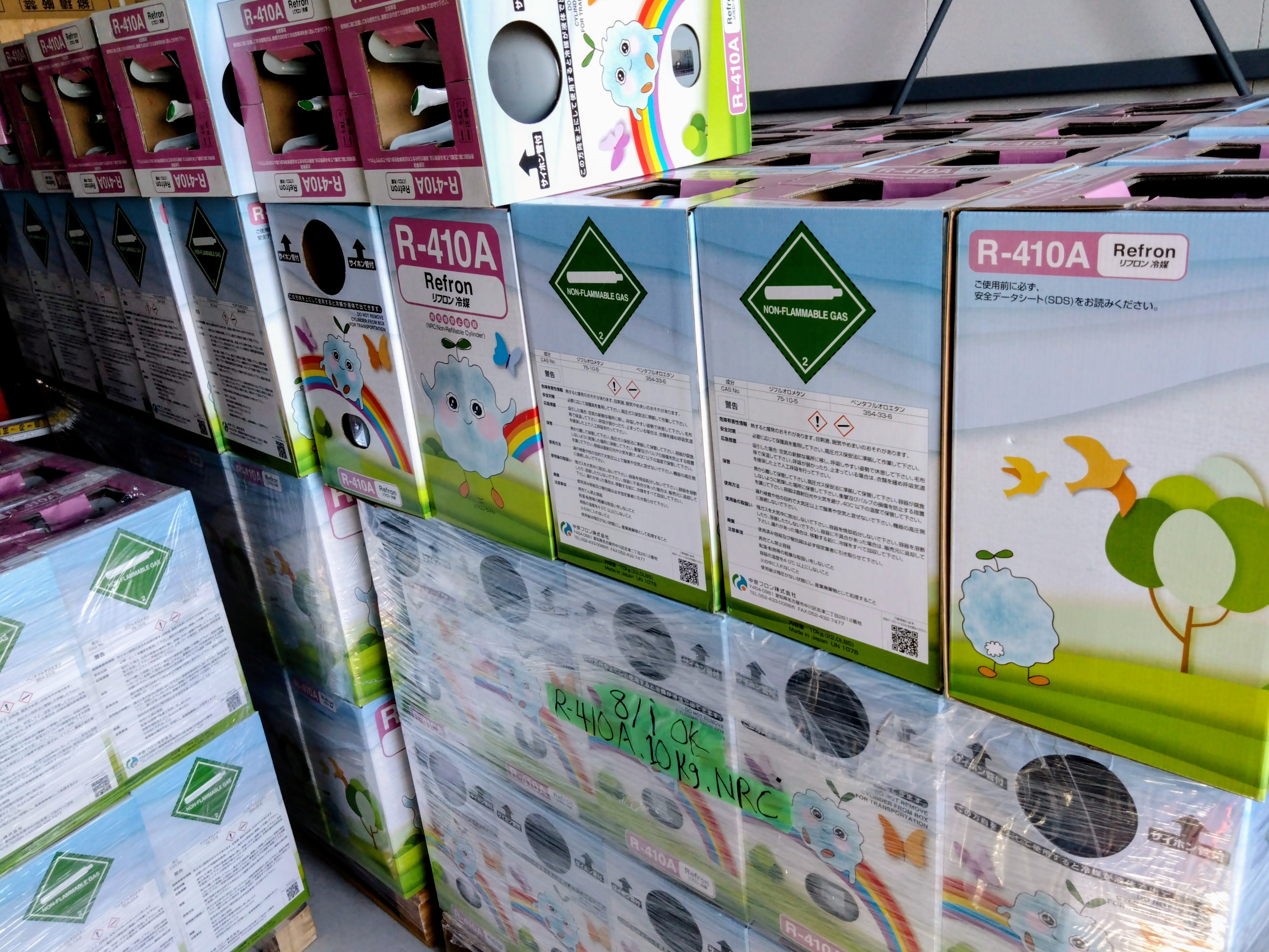 本日は、エアコンに追加充填するための冷媒ガスが納品されました。